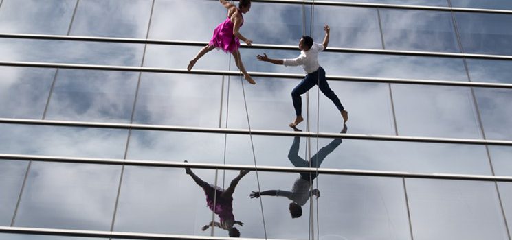 There, a group of dancers from the Bandaloop performing group can be seen dangling from high windowpanes and jumping in perfect synchronicity from floor to floor. It is one of the film’s most show-stopping moments, packing such a punch that still photos of the performance are making the rounds in promotional packets accompanying the release. This scene was one of the most complicated to film.